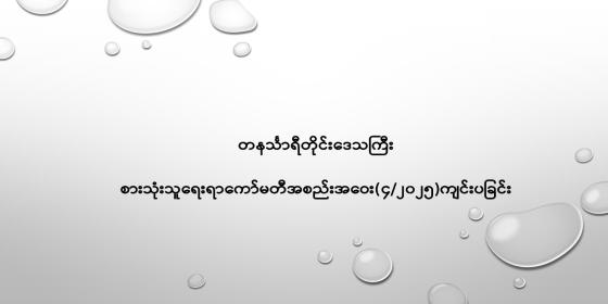 ၂၀၂၅ ခုနှစ်၊ အောက်တိုဘာ ၂၁ ရက်နေ့၊ နံနက်(၁၀:၀၀)နာရီအချိန်တွင် တနင်္သာရီတိုင်းဒေသ ကြီး၊ စားသုံးသူရေးရာကော်မတီအစည်းအဝေး(၄/၂၀၂၅) ကို စာသုံးသူရေးရာဦးစီးဌာန၊ တနင်္သာရီ တိုင်းဒေသကြီးဦးစီးမှူး