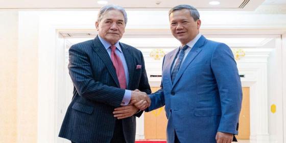 ၃၀-၁၁-၂၀၂၅ ရက်နေ့က ကမ္ဘောဒီးယားနိုင်ငံ၊ ငြိမ်းချမ်းရေးနန်းတော်တွင် နယူးဇီလန်နိုင်ငံခြားရေးဝန်ကြီး Winston Peters က ဝန်ကြီးချုပ် Hun Manet အား ဂါရဝပြုတွေ့ဆုံပြီးနောက် ကမ္ဘောဒီးယားနှင့် နယူးဇီလန်နိုင်ငံတို့သည် ကဏ္ဍများစွာတွင် ပူးပေါင်းဆောင်ရွက်မှုကို ခိုင်မာအောင် တိ