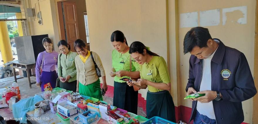 စားသုံးသူရေးရာဦးစီးဌာန ၊ ကျန်းမာရေးဦးစီးဌာန၊ ကျောင်းကျန်းမာရေးအဖွဲ့ တို့နှင့်ပူးပေါင်း၍ (၃-၁၂-၂၀၂၅) ရက် ၊ နံနက်(၀၈:၃၀) နာရီအချိန် တွင် ဘားအံမြို့ရှိ အ.မ.က မူလွန် (၁) အခြေခံပညာ မူလတန်းလွန်ကျောင်း၌ ကျောင်းမုန့်ဈေးတန်း (၂)ဆိုင်တွင် ရောင်းချနေသော စားသောက်ကုန်များကို ကုန်အညွှန်းအမှတ်အသားဖော်ပြခြင်းနှင့် စပ်လျဉ်း၍ မြန်မာနိုင်ငံစားသုံးသူကာကွယ်ရေး ကော်မရှင် ညွှန်ကြားချက် အမှတ်၊ ၂/၂၀၁၉ နှင့်အညီ ကိုက်ညီမှု ရှိ / မရှိ ဈေးကွက် စောင့်ကြည့်စစ်ဆေးခဲ့ကြောင်း သိရသည်။