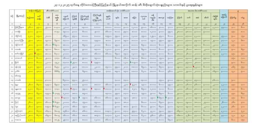 တိုင်းဒေသကြီး/ပြည်နယ် မြို့နယ်များအလိုက် ၂၃-၁၂-၂၀၂၅ရက်နေ့တွင် ဖြစ်ပေါ်လျက်ရှိသော ဆန်၊ ဆီ၊ မီးဖိုချောင်သုံးပစ္စည်းများ၊ သားငါးနှင့် ဥဈေးနှုန်းများကို ပူးတွဲပါ ဖိုင်တွင် ကြည့်ရှုနိုင်ပါသည်-