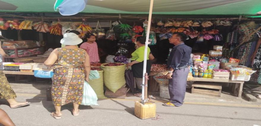 ရန်ကုန်တိုင်းဒေသကြီး၊ တွံတေးခရိုင်၊ စားသုံးသူရေးရာဦးစီးဌာနမှ မြို့နယ်တာဝန်ခံနှင့် ဝန်ထမ်းများသည် တောင်ပိုင်းခရိုင်ဦးစီးမှူးရုံး၏ညွှန်ကြားချက်နှင့်အညီ ဈေးကွက်အတွင်း ရောင်းချနေသော အခြေခံစားသောက်ကုန်ဈေးနှုန်းများအား စာရင်းကောက်ယူ၍ အပတ်စဉ် တင်ပြလျှက်ရှိရာ မြို့နယ်စည်ပင်သာယာရေးအဖွဲ့နှင့်ပူးပေါင်း၍ အောက်တိုဘာလ(၁၃)ရက်နေ့၊ နံနက်(၀၉:၃၀)နာရီအချိန်တွင် ကွမ်းခြံကုန်းမြို့နယ် မြို့မဈေးသို့ ကွင်းဆင်းစိစစ်ခဲ့ကြောင်း သိရှိရ သည်။