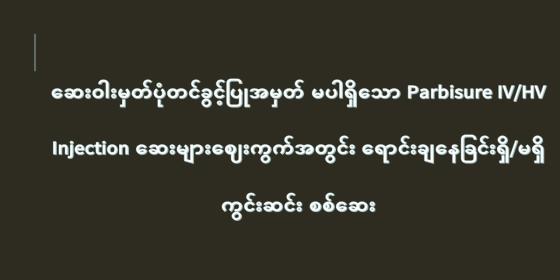 ဆေးဝါးမှတ်ပုံတင်ခွင့်ပြုအမှတ် မပါရှိသော Parbisure IV/HV Injection ဆေးများဈေးကွက်အတွင်း ရောင်းချနေခြင်းရှိ/မရှိ ကွင်းဆင်း စစ်ဆေး