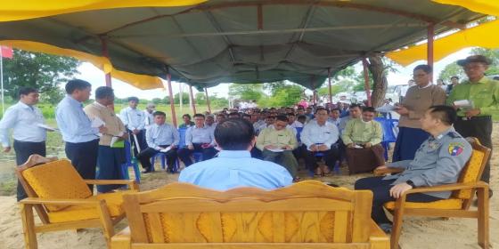 မကွေးတိုင်းဒေသကြီးအစိုးရအဖွဲ့ဝန်ကြီးချုပ် ဦးတင့်လွင်သည် မြို့သစ်မြို့နယ်၊ မိုးစပါးမျိုးစေ့ထုတ် စံပြကွက်၌ပြုလုပ်သော မြေဩဇာကြဲပက်ပွဲအခမ်းအနားသို့တက်ရောက်ကာ စပါးစိုက်တောင်သူများနှင့်တွေ့ဆုံ