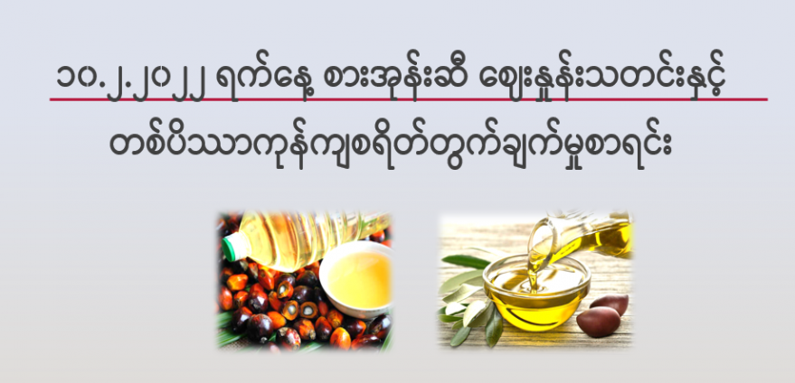 » ၁၀.၂.၂၀၂၂ ရက်နေ့ စားအုန်းဆီ ဈေးနှုန်းသတင်းနှင့် တစ်ပိဿာကုန်ကျစရိတ်တွက်ချက်မှုစာရင်း