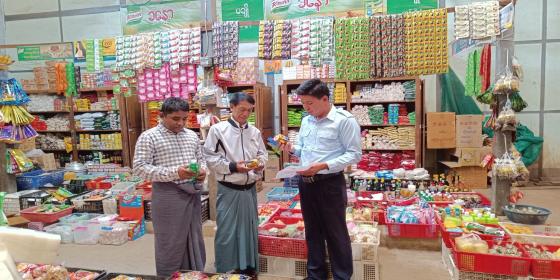 စားသုံးသူရေးရာဦးစီးဌာန၊ မြန်အောင်မြို့နယ်ဦးစီးမှူးနှင့် ဝန်ထမ်းများသည် သက်ဆိုင်ရာဌာန ဆိုင်ရာများနှင့် ပူးပေါင်း၍ စားသုံးသူများအသုံးပြုလျက်ရှိသည့် ကုန်စည်နှင့်ဝန်ဆောင်မှုများ ဘေးအန္တရာယ်ကင်းရှင်းစေရေးအတွက် (၂၁.၇.၂၀၂၅)ရက်နေ့ နံနက်(၀၉:၃၀)နာရီအချိန်တွင် မြန်အောင်မြို့၊ အမှတ်(၆