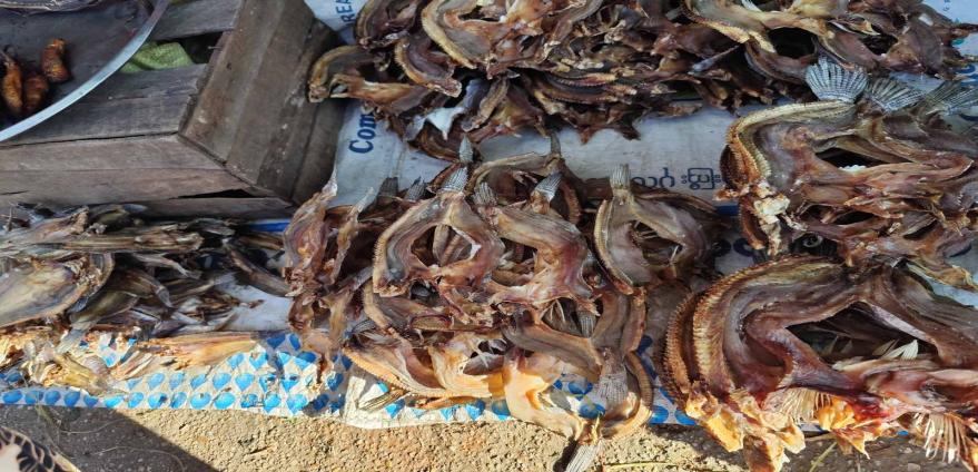 မအူပင်မြို့နယ် အင်းများမှ ထွက်ရှိသော ငါးရံ့ံ့ားကို ငါးခြောက်လှမ်း၍ ဈေးကွက်အတွင်း ရောင်းချလျက်ရှိ
