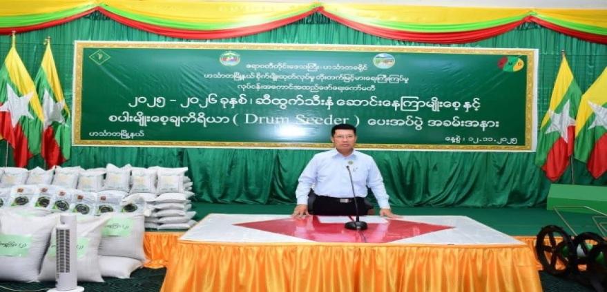 ဦးစွာတိုင်းဒေသကြီးဝန်ကြီးချုပ်က“ တိုင်းဒေသကြီးအစိုးရအဖွဲ့အနေဖြင့် ဆီထွက် သီးနှံ မြေပဲ၊ နှမ်း၊ နေကြာမျိုးစေ့များအား တောင်သူများထံပေးအပ်လျက်ရှိပါကြောင်း၊ ဆီထွက် သီးနှံဇုန်ကြီးနှစ်ဇုန်အား ဧရာဝတီတိုင်းဒေသကြီး အတွင်းရှိ မြန်အောင်ခရိုင်၊ ဟင်္သာတခရိုင်နှင့် မအူပင်ခရိုင် သတ်မှတ်အကောင်ထည် ဖော်ဆောင်ရွက်လျက်ရှိပါကြောင်း၊ ယခုနှစ်တွင် နေကြာ စိုက်ဧက(၂)သိန်း(၂) သောင်း(၆)ထောင်အား စိုက်ပျိုးသွားမည်ဖြစ်ပါကြောင်း၊ နေကြာစတင်စိုက်ပျိုး သည့်အချိန်မှ အထွက်နှုန်းများတိုးတက်လာသည်ကိုတွေ့ရပါကြောင်း၊ နေကြာစိုက်ပျိုးရာတွင် နိုဝင်ဘာလတွင် အကောင်းဆုံးဖြစ်ပါကြောင်းနှင့် အောင်မြင်အောင်ဆောင်ရွက်ကြရန်လိုပါကြောင်း၊ စပါးစိုက်ပျိုးရာတွင် ကြဲခင်းများပပျောက်ရေးအတွက် မျိုးစေ့ချကိရိယာ (Drum Seeder) ပေးအပ်ခြင်းလည်းဖြစ်ပါကြောင်း၊ ပဲပုပ်-ပဲကြီး ရောနှော ဧက(၁)သိန်းကိုလည်း စိုက်ပျိုး ဆောင်ရွက်လျက်ရှိပါကြောင်းနှင့် ဟင်္သာတမြို့နယ်သည် ပဲပုပ်-ပဲကြီး ရောနှောစိုက်ပျိုးရာတွင် အောင်မြင်ဖြစ်ထွန်းသည်ကိုလည်း တွေ့ရပါကြောင်း၊ ဆီဖူလုံရေးအတွက် ဝိုင်းဝန်းကြိုးပမ်း ဆောင်ရွက်ရန်လိုပါကြောင်း” အမှာစကားပြောကြားပြီး တိုင်းဒေသကြီးဝန်ကြီးချုပ်နှင့် အစိုးရ အဖွဲ့ဝင် ဝန်ကြီးများသည် ဆီထွက်သီးနှံဆောင်းနေကြာမျိုးစေ့နှင့် မျိုးစေ့ချကိရိယာ ( Drum Seeder) ပေးအပ်ခဲ့ကြောင်း သိရပါသည်။