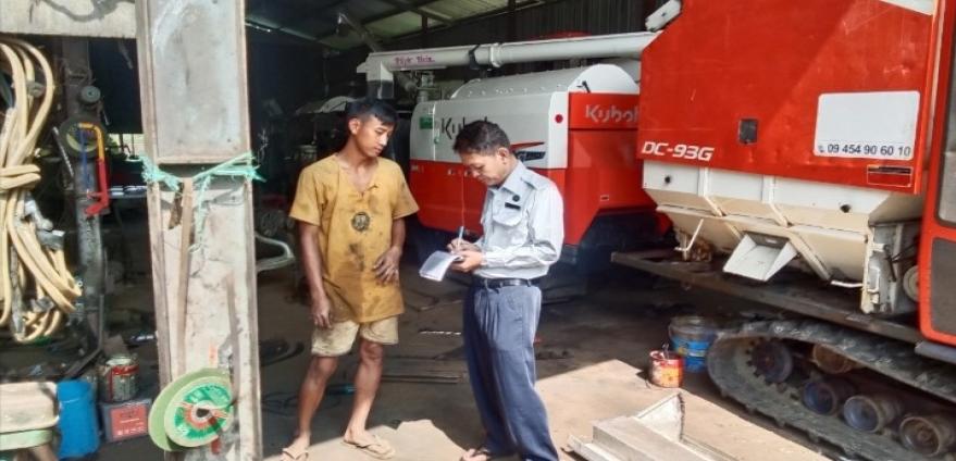 ထိုသို့ကွင်းဆင်းခဲ့ရာတွင်မြို့နယ်တာ၀န်ခံက"ကိုချစ်တီး"စက်မှုလက်မှုပိုင်ရှင်အားလုပ်ငန်းလည်ပတ်မှုနှင့်ပတ်သက်ပြီးမေးမြန်းရာ မိမိတို့အနေဖြင့်ဖြတ်ဆက်၊ ၀ရိန်းနှင့်စပါးရိတ်စက် လှောင်ကန်အပေါ်ဆင့် အောက်ဆင့်အထိုင်၊ ဂေါ်၊ပျက်ရင်ပြင်ကြောင်း တစ်စီးပြီးမြောက်ရန် ၁၁ရက်ခန့် အချိန်ယူရ ကြောင်း နှင့်လုပ်အားခအနေဖြင့်စပါးရိတ်စက်တစ်စီးလျှင်(၃၂၀,၀၀၀)ကျပ်ယူကြောင်း ပြောကြားခဲ့ပြီး လုပ်သားအင်အားအနေဖြင့် ကိုယ့်မိသားစုဖြစ်သာလုပ်ကိုင်ပြီးလုပ်သား၂ဦးဘဲ ငှားထားကြောင်း၊လစာနှုန်းထားအနေ ဖြင့်တစ်လလျှင်၃၃၀၀၀၀ကျပ်ပေးကြောင်း ပြောကြားခဲ့ပြီး မြို့နယ်တာ၀န်ခံမှ လိုအပ်သည်များမှာကြားခဲ့ကြောင်း သတင်းရရှိပါသည်။
