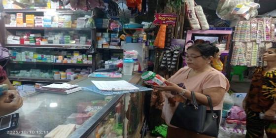 စားသုံးသူရေးရာဦးစီးဌာန၊ မြောက်ပိုင်းခရိုင်ဦးစီးမှူးရုံး၊ မှော်ဘီမြို့နယ်ခွဲရုံးမှ ဒေါ်ဖြူဖြူမြင့်၊ ဒုကြီးကြပ်ရေးမှူးသည် (၁၃.၁၀.၂၀၂၅) ရက်နေ့ နံနက် (၁၀:၀၀) နာရီအချိန်တွင် ပြည်လမ်း၊ ပေတရာလမ်း၊ တပ်ကြီးကုန်းမြို့နယ်ရှိ ကုန်စုံဆိုင်များတွင် ကလေးအာဟာရဖြည့်စွက်စာအမျိုးမျိုးတွင် ကုန