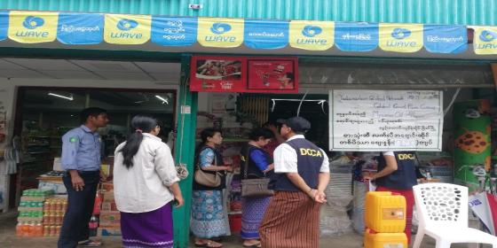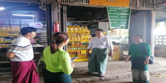 စားသုံးသူရေးရာဦးစီးဌာန၊ ရန်ကုန်အနောက်ပိုင်းခရိုင်ဦးစီးမှူးရုံးမှ စစ်ဆေးရေးအရာရှိ(၂)ဦး နှင့် ဝန်ထမ်း(၂) ဦးတို့သည် လသာမြို့နယ်အတွင်းရှိ ဦးစိန်ဝင်း (ဆီဆိုင်) နှင့် ဒေါ်မြမြအေး (ဆီဆိုင်) တို့အား ဈေးတာဝန်ခံတို့နှင့် ပူးပေါင်းပြီး ဆီရောင်းချမှု အခြေ အနေများအား ကွင်းဆင်းစစ်ဆေး အသိပညာပေ
