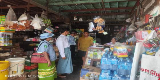 စားသုံးသူရေးရာဦးစီးဌာန၊ မအူပင် ခရိုင်၊ ဓနုဖြူမြို့နယ်ဦးစီးမှူးရုံးမှ ဦးခိုင်လွမ်းမိုး နှင့် ဝန်ထမ်း (၂)ဦးသည် မြို့နယ်ကျန်းမာရေးဦးစီးဌာန၊ မြို့နယ်စည်ပင်သာယာရေး အဖွဲ့တို့နှင့်အတူ ၁၁.၁၁.၂၀၂၅ ရက်နေ့၊ နေ့လယ် (၁၂:၀၀) နာရီအချိန်တွင် မြို့နယ်ဈေးအတွင်းရှိ စားသောက်ကုန်မျိုးစုံနှင့် အချိုရည်အမ