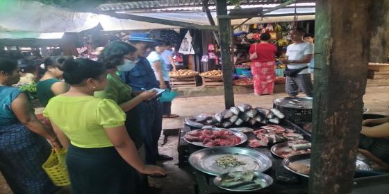 (၄.၉.၂၀၂၅) ရက်နေ့၊ နံနက် (၉:၃၀) နာရီအချိန်တွင် စားသုံးသူရေးရာဦးစီးဌာနမှ မြို့နယ်တာဝန်ခံနှင့် ဝန်ထမ်းသည် စည်ပင်သာယာရေးအဖွဲ့ ဈေးအရာရှိများနှင့် အတူ အောင်ဧရာဈေးရှိ ငါးစိမ်းရောင်းချသော ဒေါ်ဂျမ်းပုံ ငါးစိမ်းအရောင်းဆိုင်သို့ ငါးဈေးများအား ကွင်းဆင်းစုံစမ်းခဲ့ရာ ငါးမြစ်ချင်း အကောင်လိုက် တ