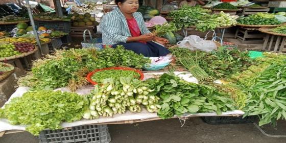 တောင်ငူမြို့နယ်အတွင်းရှိ ညောင်ပင်လေးဈေးတွင် ဟင်းသီးဟင်းရွက်များနှင့် အသားငါးများ ရောင်းချလျက်ရှိရာ ကန်စွန်းရွက် ၁ စည်းလျှင် ၂၀၀ ကျပ် ၊ ၃ စီးလျှင် ၅၀၀ ကျပ် ဈေးနှုန်းရှိပြီး ၁၀ စည်းနှင့်အထက် ဝယ်ယူပါက ဖောက်သည်ဈေး