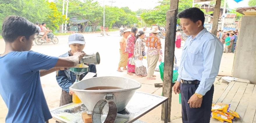 စားသုံးသူရေးရာဦးစီးဌာန စစ်ကိုင်းတိုင်းဒေသကြီး ကန့်ဘလူခရိုင် ကန့်ဘလူမြို့နယ်တာဝန် ခံဦးမျိုးဝင်းသန်းသည် ၂၀၂၅ ခုနှစ်၊ အောက်တိုဘာလ ၉ ရက် နံနက်(၀၉:၃၀)နာရီအချိန်တွင် ကန့်ဘလူမြို့နယ်ဆီကိုယ်စားလှယ်မှ အမှတ်(၃)ရပ်ကွက်ရှိ၊ စားသုံးသူပြည်သူများအား စားအုန်းဆီ လက်လီရောင်းချပေးနေမှုအား ကွင်းဆင်းစစ်ဆေးခဲ့ကြောင်း သိရှိရပါသည်။