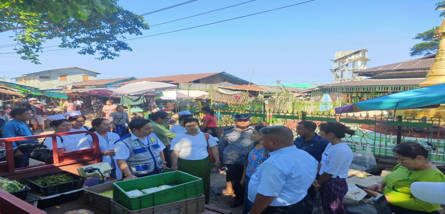 ထိုသို့ ကွင်းဆင်းဆောင်ရွက်ခဲ့ရာတွင် အထွေထွေအုပ်ချုပ်ရေးဦးစီးဌာနမှ ဌာနခွဲစာရေး ဒေါ်အေမီအောင်၊ မြို့နယ်ရဲတပ်ဖွဲ့မှ ဒုတိယရဲမှူး ဦးသောင်းရွှေနှင့်တပ်ဖွဲ့ဝင်များ၊ မြို့နယ်ပြည်သူ့ကျန်းမာရေးဦးစီးဌာနမှ ဦးစီးအရာရှိ ဒေါက်တာ အိနန္ဒာကျော်နှင့် ကျန်းမာရေးမှူး အဆင့်(၁) ဦးစိုးဝင်းထွန်း၊ မွေးမြူရေးနှင့်ကုသရေးဦးစီးဌာနမှ ဦးစီးအရာရှိ ဒေါက်တာမိုးဆမ်းပန်း၊ စားသုံးသူရေးရာဦးစီးဌာနမှ မြို့နယ်တာဝန်ခံ ဦးတင်မင်းနှင့် ဒုတိယဦးစီးမှူး ဒေါ်နီလာဝင်းနှင့် မြို့နယ်စည်ပင်သာယာရေးအဖွဲ့မှ ဌာနခွဲစာရေး ဒေါ်သဲစုရီနှင့်ဝန်ထမ်းများ ပူးပေါင်းအဖွဲ့ဖြင့် အခြေခံစားသောက်ကုန်ပစ္စည်းများဖြစ်သော ပဲပြား၊ ပဲသွေး၊ မျှစ်အဝါ၊ မျှစ်အနီ၊ စိမ်းစားငံပိ (မျှင်ငံပိ)တို့တွင် Auramine-O ခွင့်မပြုဆိုးဆေးပါဝင်ခြင်းမရှိသော အမျိုးအစားများကိုသာ ဝယ်ယူဖြန့်ဖြူးရောင်းချခြင်းများ မပြုလုပ်ကြရန်နှင့် စားသုံးသူပြည်သူများ ဘေးအန္တရာယ်ကင်း ရှင်းစေရေး အသိပညာပေးပြောကြား ကွင်းဆင်းစစ်ဆေးခဲ့ကြောင်း သိရှိရပါသည်။