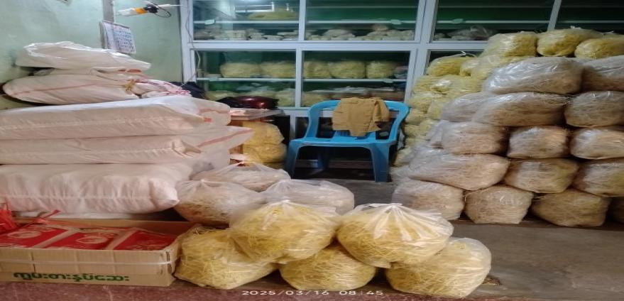 ၂၀၂၆ခုနှစ်၊ ဇန်နဝါရီလ(ဒုတိယပတ်)တွင် ခေါက်ဆွဲခြောက်ထုပ်များ ဈေးငြိမ်၍ အရောင်း အဝယ်ဖြစ်နေကြောင်း၊ ခေါက်ဆွဲတွင် အဝါရောင်နှင့် အဖြူရောင်နှစ်မျိုးရှိကြောင်း၊ ရောင်းချရာတွင် ခေါက်ဆွဲသား အကောင်းနှင့် စက်ကျအကျိုးအကြေနှစ်မျိုး ခွဲခြားပြီးရောင်းချကြောင်း၊ “ရွှေဒင်္ဂါး “ အဝါရောင် ခေါက်ဆွဲခြောက် တစ်စီးလျှင် ကျပ်(၉၀၀)၊ (၂၅)ထုပ်ပါ တစ်ထုပ်လျှင် ကျပ် (၂၁၅၀၀)၊ ခေါက်ဆွဲကျိုး စက်ကျ တစ်ပိဿာလျှင် ကျပ်(၇၀၀၀)ဈေးဖြင့် အရောင်းအဝယ်ဖြစ်ကြောင်း၊ “စွမ်းထက်” ခေါက်ဆွဲခြောက် (၅၀)ကျပ်သား ပါ တစ်ထုပ်လျှင် ကျပ်(၄၅၀၀)၊ အထုတ်(၃၀)ပါ တစ်ဖာလျှင် ကျပ်(၁၃၅၀၀၀)၊ (၂၀)ကျပ်သားပါ တစ်ထုပ်လျှင် ကျပ်(၂၃၀၀)၊ (၅၀)စီးပါ တစ်ဖာလျှင် ကျပ်(၁၁၅၀၀၀)၊ (၂)စီးတွဲ တစ်ထုပ်လျှင် ကျပ်(၁၈၀၀)၊ (၅၀)စီးပါ တစ်ဖာလျှင် ကျပ်(၉၀၀၀၀)၊ “စွမ်းထက်”ခေါက်ဆွဲ စက်ကျအကျိုး တစ်ပိဿာလျှင် ကျပ်(၅၀၀၀)၊ “ရွှေနဒီ” ခေါက်ဆွဲထုပ်ကြီး တစ်ထုပ်လျှင် ကျပ်(၁၅၀၀)၊ အထုပ်သေး တစ်ထုပ်လျှင် ကျပ်(၅၀၀)နှုန်းဖြင့် အရောင်းအဝယ် သွက်နေကြောင်း၊ ယခုအချိန် စာသင်ကျောင်းများ ဖွင့်လှစ်ချိန်ဖြစ်၍ ကျောင်းမုန့်ဈေးတန်းများတွင် ခေါက်ဆွဲသုပ်၊ ခေါက်ဆွဲကြော်များ ရောင်းချမှုများခြင်းကြောင့် အရောင်းအဝယ်သွက်နေပြီး မြိုင်၊ ရေစကြို၊ ယောနယ်ဒေသများမှလည်း ကုန်ကားများမှတဆင့် မှာယူပြီး ဝယ်ယူမှုများလျက်ရှိ ကြောင်း၊ တစ်ပတ်အတွင်း ခေါက်ဆွဲခြောက်ပိဿာ (၃၅၀-၄၀၀)ခန့် ရောင်းချရကြောင်း ကုန် ခြောက်ဆိုင် ရောင်းချသူထံမှ သိရှိရပါသည်။