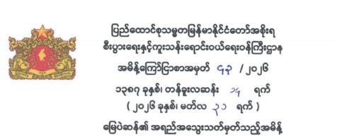 စီးပွားရေးနှင့်ကူးသန်းရောင်းဝယ်ရေးဝန်ကြီးဌာနသည် ပို့ကုန်သွင်းကုန်ဥပဒေပုဒ်မ ၁၃ ပုဒ်မခွဲ(ခ) အရ အပ်နှင်းထားသည့် လုပ်ပိုင်ခွင့်ကို ကျင့်သုံး၍ ဈေးကွက်အတွင်း မြေပဲဆန်ရောင်းဝယ်ဖောက်ကားရာတွင် တစ်သမတ်တည်းဖြစ်စေရန်အလို့ငှာ ၃၁-၃-၂၀၂၆ ရက်စွဲဖြင့် မြေပဲဆန်၏ အရည်အသွေးသတ်မှတ်သည့်အမိန့်ကို ထုတ်ပြန်ခဲ့ရာ အောက်ပါ PDF File အား Download ရယူကြည့်ရှုနိုင်ပါသည်။